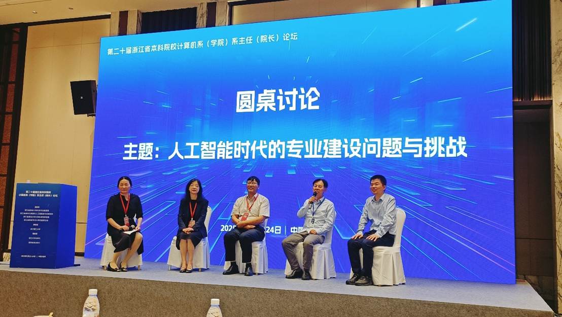 论坛设主题报告,来自省内外7个高校的专家分别以《引智创新:南京大学计算机学科在师资队伍建设和国际化方面的探索》《计算机类专业在GAI浪潮下的变革与突破》《浙江大学AI专业和课程体系》《浙江大学〈人工智能基础〉系列通识课程ABC》《人工智能时代的艺术使命》《人工智能实践与应用》为题,依次进行了精彩纷呈的报告分享。报告会后,杭州电子科技大学林菲教授主持了《人工智能时代的专业建设问题与挑战》圆桌研讨会,张帅院长与参会专家就人工智能专业与计算机专业的差异化发展、高校教师面对人工智能挑战的策略以及学生使用AI生成代码应对课程的应对措施等深层次问题进行了热烈讨论。