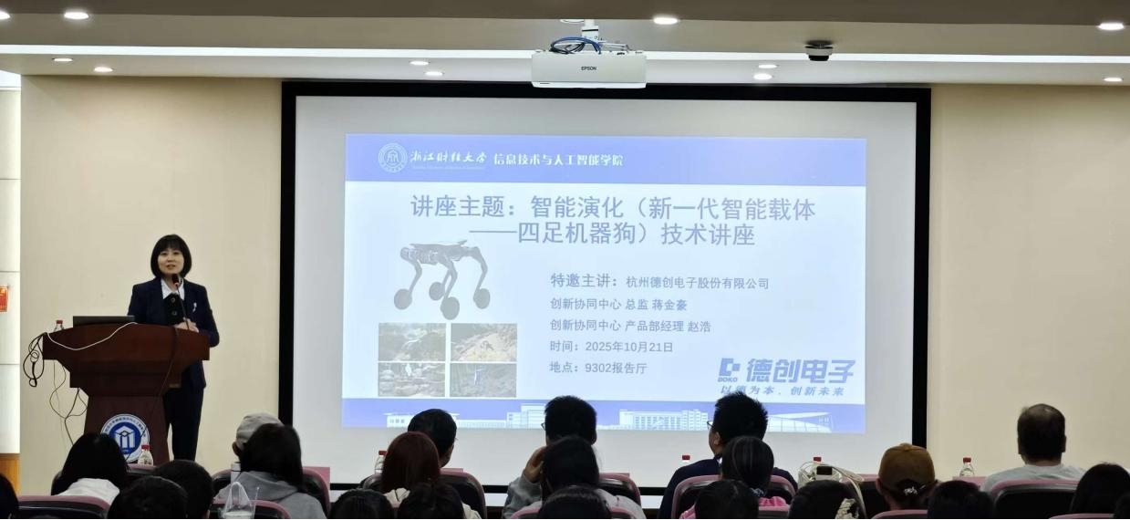 2025年10月21日,巴卡漫画 特邀杭州德创电子股份有限公司创新协同中心总监蒋金豪、产品部经理赵浩,在9302报告厅举办《智能演化(新一代智能载体)——四足机器狗技术讲座》。学院副院长朱凌主持讲座,院长助理/计算机系主任陈明晶、智能物联网及嵌入式开发课程资深教师张后旗、电子电路课程骨干教师杨泽、机器人课程骨干教师张翔等教师及相关本科生、研究生共130余人参与。