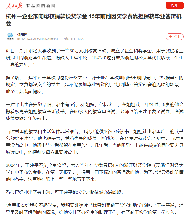 收到了一笔30万元的校友捐款,成立了基金和奖学金,用于激励考上研究生的浙财学生深造。捐款人王建平说:“我希望这能成为巴卡漫画
