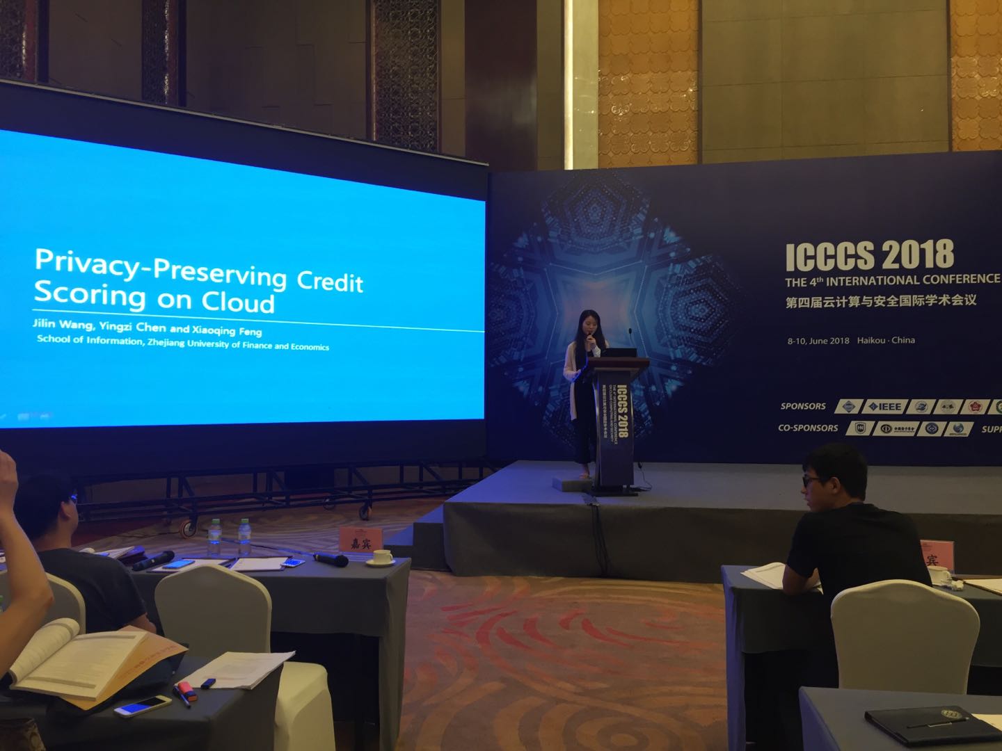 16级企业管理专业研究生陈英姿参加了此次国际会议并在其分论坛就“Privacy-Preserving Credit Scoring on Cloud”主题做会议报告,并与专家学者们进行深入的交流和讨论。