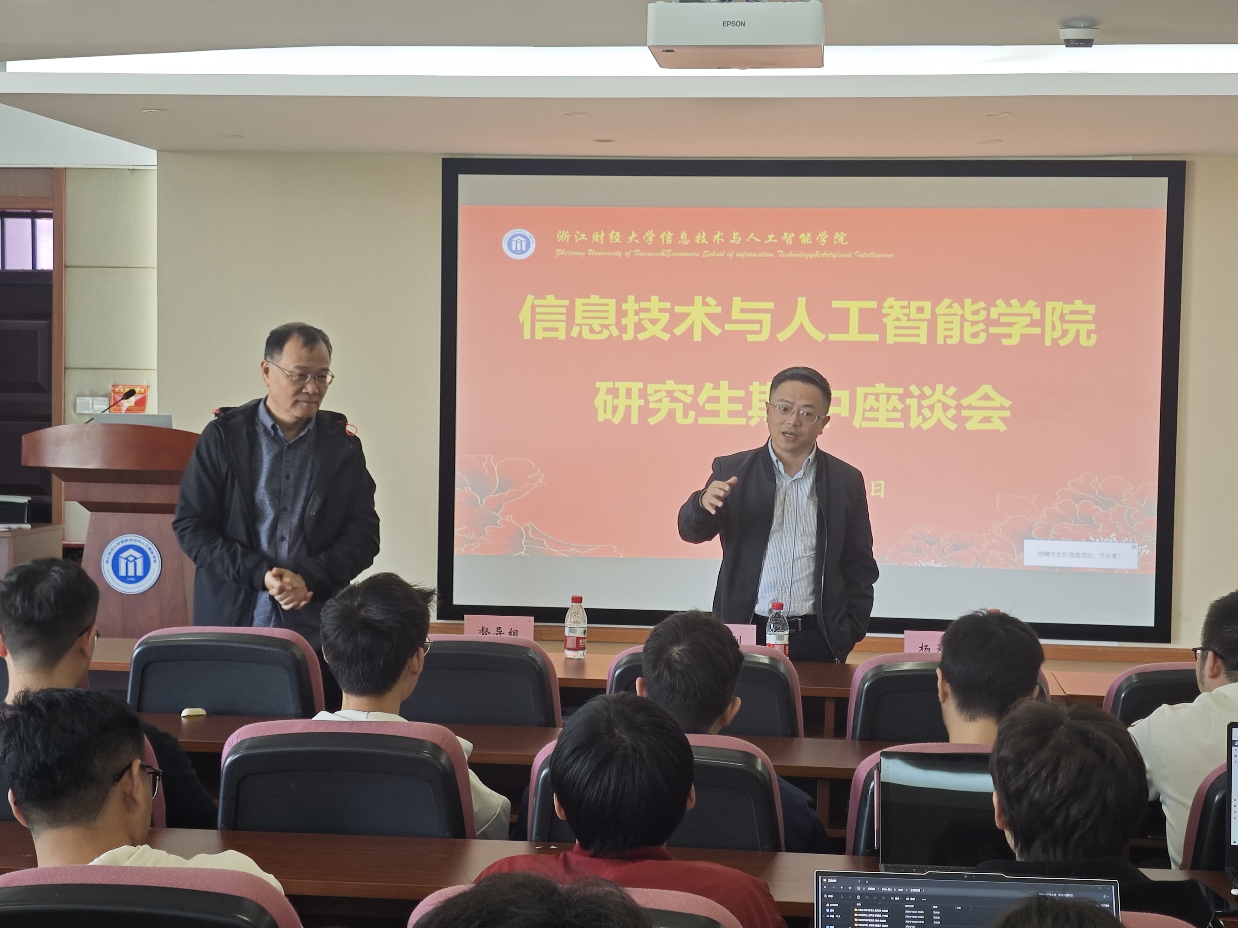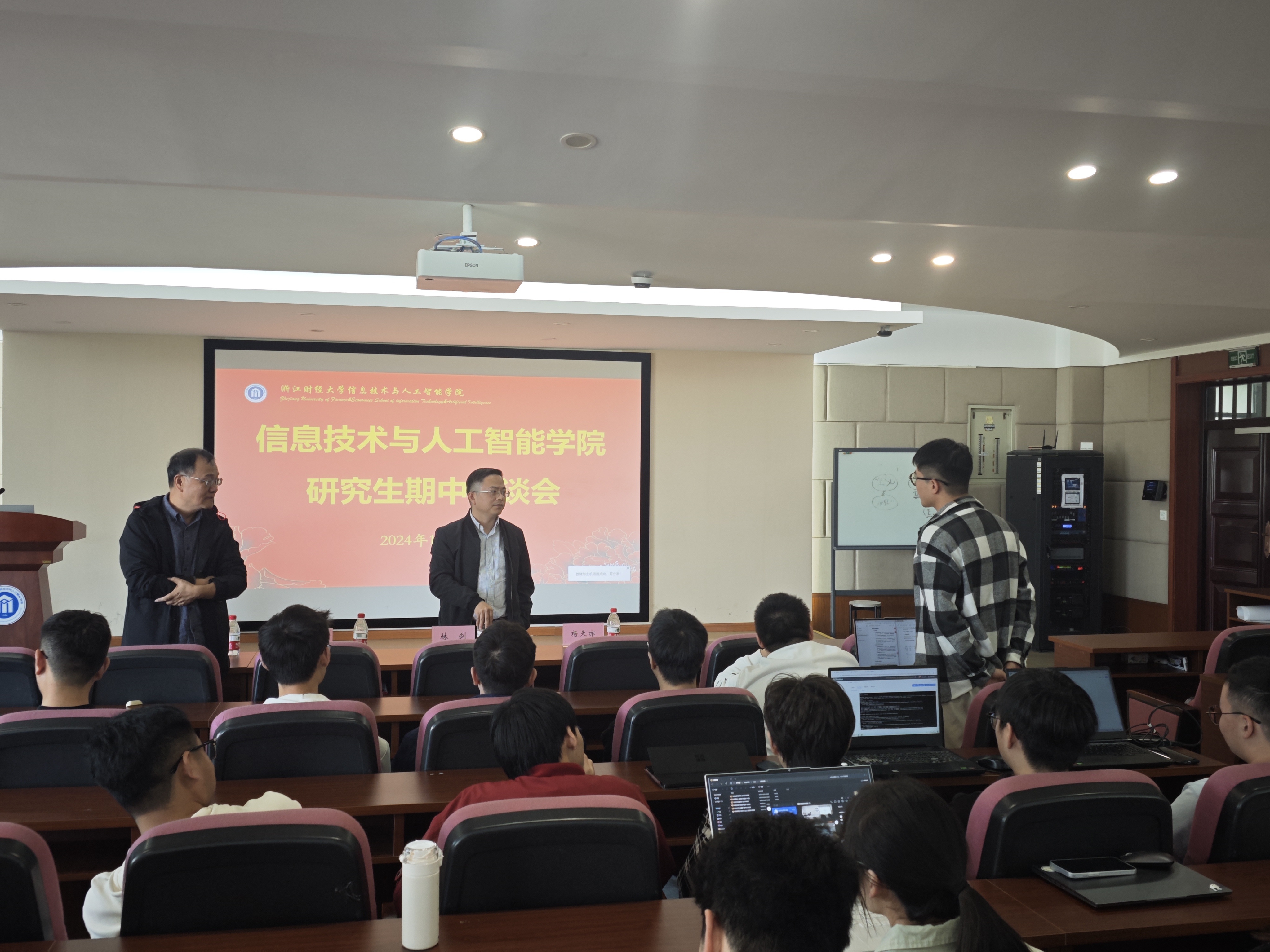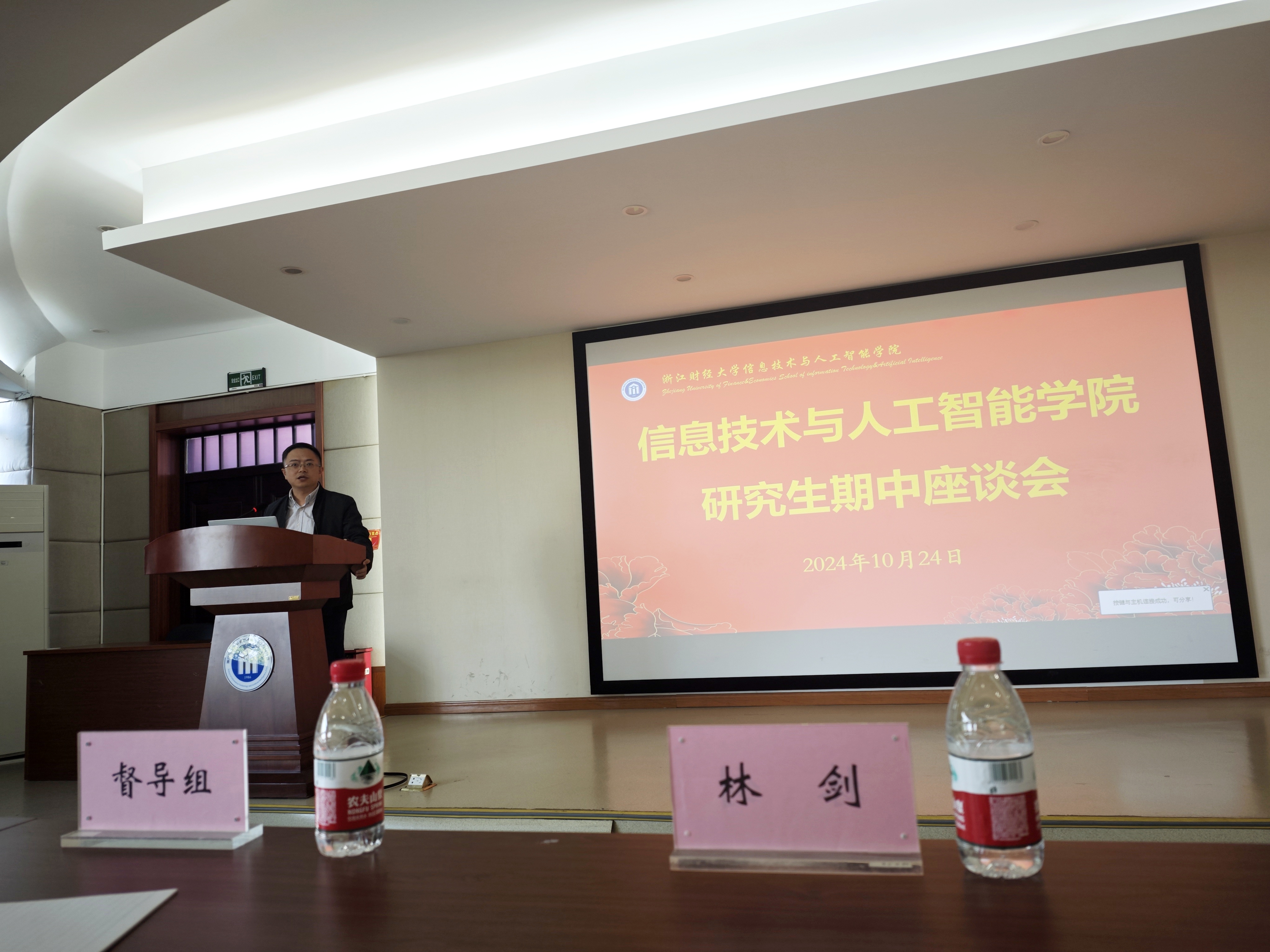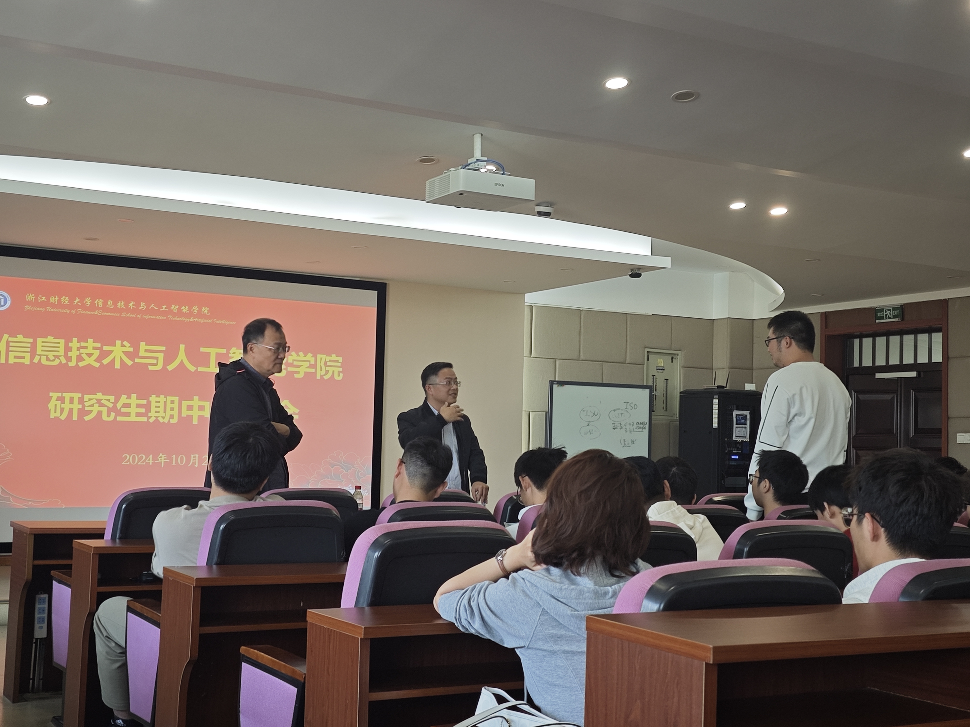 在9302会议室召开了2024-2025学年秋学期研究生期中座谈会。此次会议由学院副院长林剑教授主持,研究生教学督导组姚建荣教授、研究生辅导员吴泽勇、研究生秘书杨天亦及2024级全体硕士生和博士生参加。