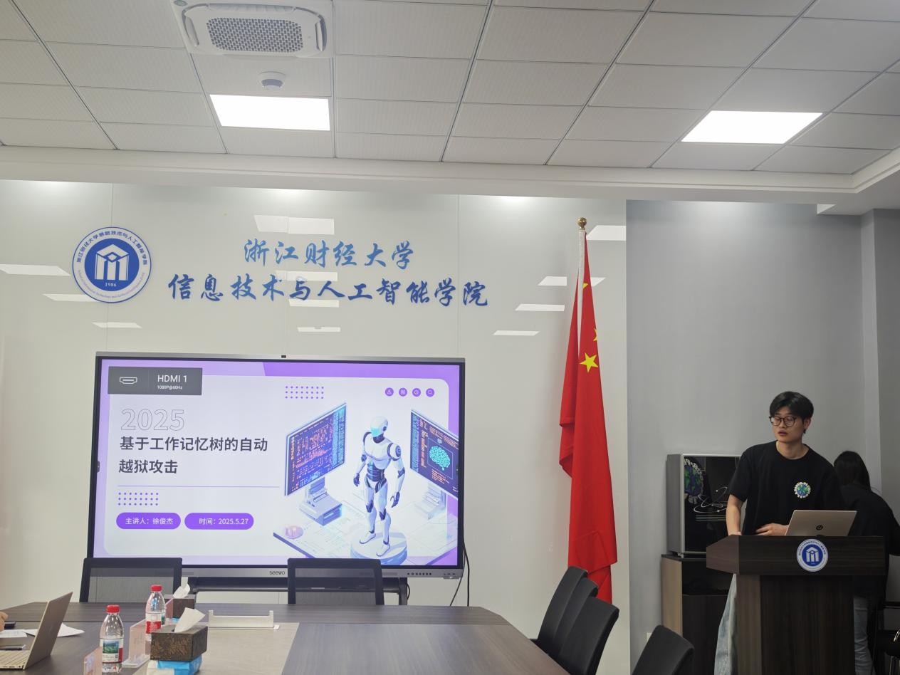 徐俊杰同学则围绕《基于工作记忆树的自动越狱攻击》开展了讲解,提出了智能系统防护的新思路。
