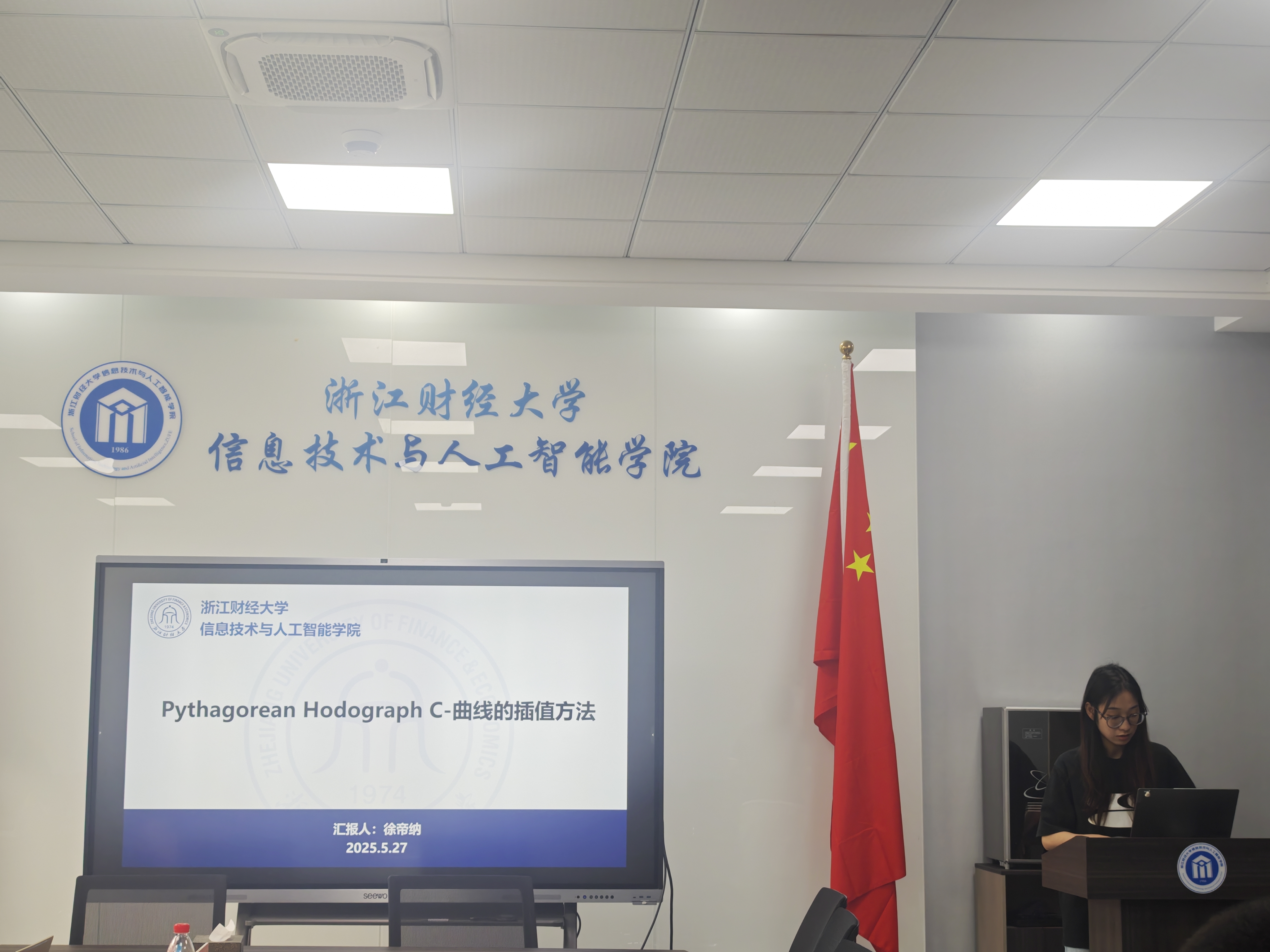 徐帝纳同学以《Pythagorean Hodograph C-曲线的插值方法》为题,分享了其在曲线拟合及CAD应用方面的研究成果;