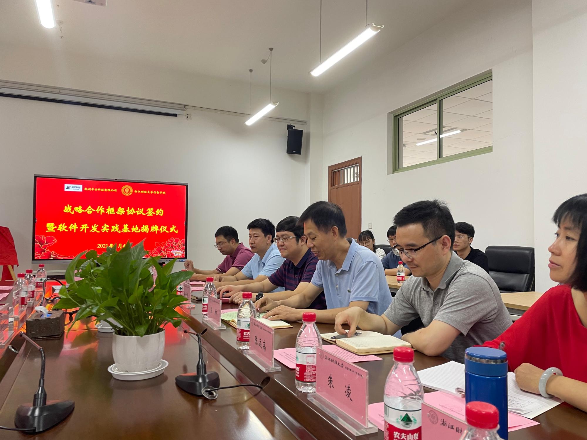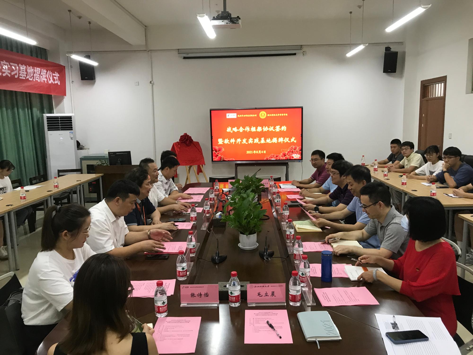 张帅与宋小波分别代表双方签订《战略合作框架协议》及《城市大脑数据智能应用场景关键技术研究与开发》合同。随后,两位与徐奇伟、丁树成四人共同为“软件开发实习基地”揭牌。