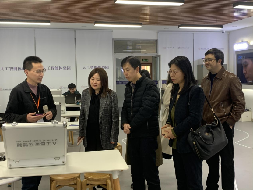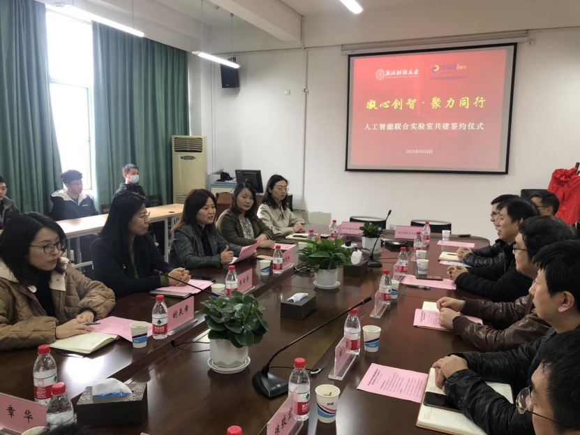 -浙江知盛集团”人工智能联合实验室揭牌仪式。浙江知盛集团联合创始人、CEO王晓梅,知盛集团中国区研发负责人韩津、知盛集团市场及品牌副总裁朱丽萍、信智学院院长张帅、学院党委书记徐奇伟、副院长陈远高、副书记田聪以及人工智能系教师、研究生、本科生代表等出席了签约仪式。