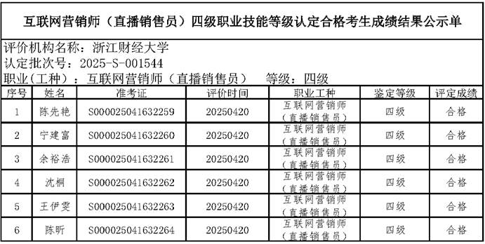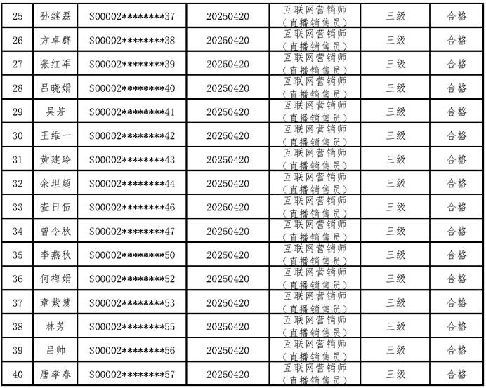 二、关于编号:2025-S-001544互联网营销师(直播销售员)四级职业技能等级认定成绩合格人员结果公示单