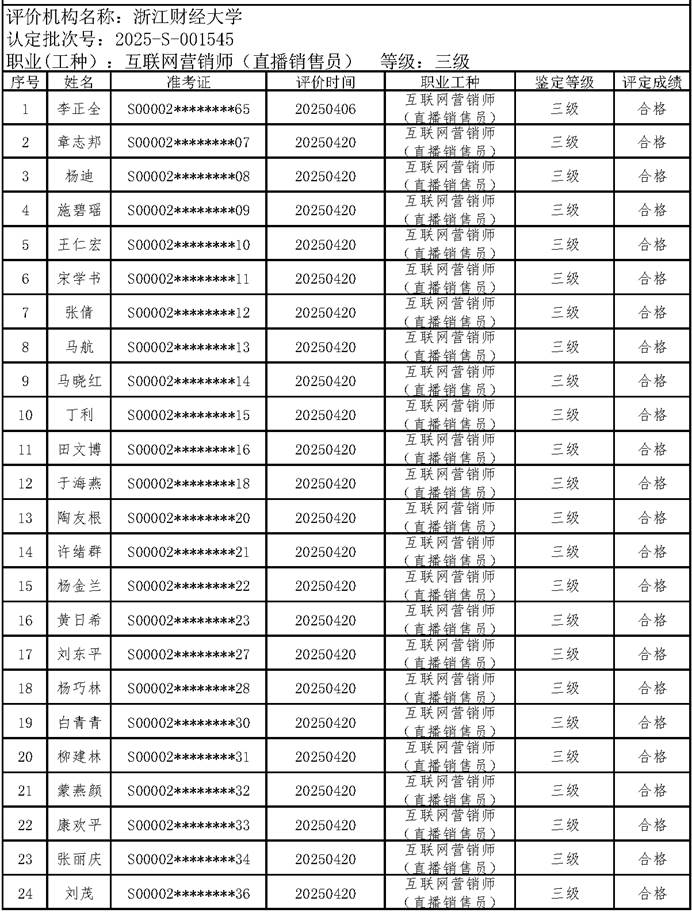 一、关于编号:2025-S-000121互联网营销师(直播销售员)三级职业技能等级认定成绩合格人员结果公示单
