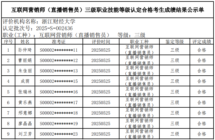 一、关于编号:2025-S-002436互联网营销师(直播销售员)三级职业技能等级认定成绩合格人员结果公示单