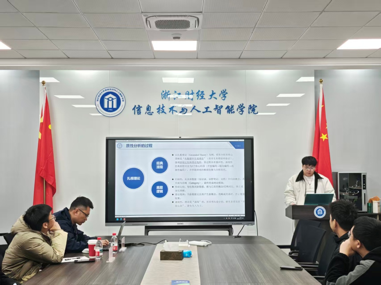 在9-404教室顺利举办了2025年第5期(总第28期)“数智钱潮”研究生论坛。本期论坛由学术部同学主持,邀请了涂乐博士、陈勇博士担任点评专家,吸引了众多研究生积极参与和热烈交流。论坛共有6名研究生进行学术汇报,内容涵盖论文图表经验分享、流水车间成组调度问题、扎根理论、在线协诊三边匹配决策方法、AI协助写作、技术多样性的调节效应研究等多个前沿研究方向。
